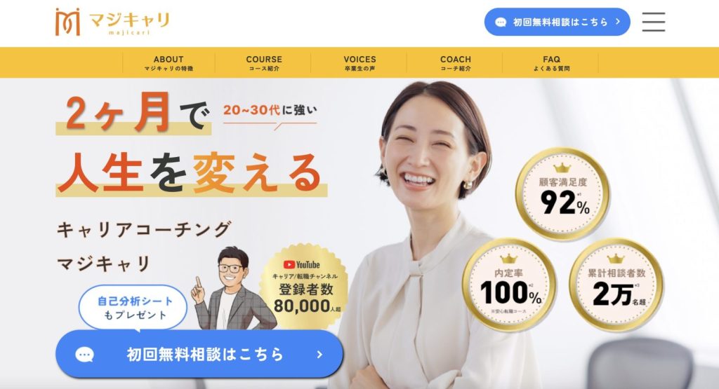 マジキャリは、特に20〜30代の若い方のキャリア支援に強みを持ったキャリアコーチングサービスです。