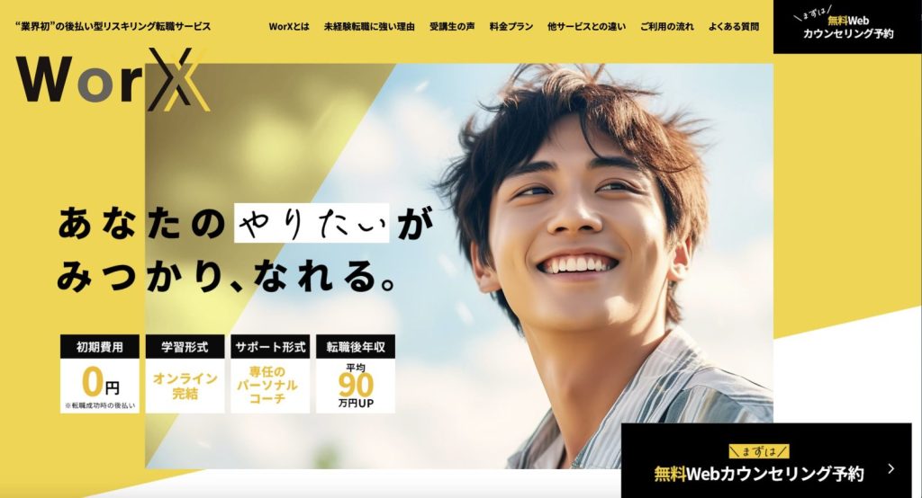 | WorX(ワークス) | 業界初の料金後払い方式 異業種への転職成功率100%で未経験転職に強み サービス受講後の年収は平均で90万円アップ Eラーニング×専属コーチへのアウトプットでスキルを習得 経済産業省の補助金の対象で最大70%オフになる |